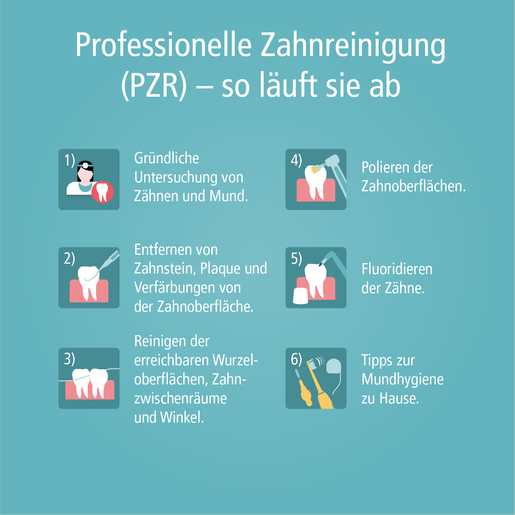 Im Rahmen einer professionellen Zahnreinigung werden die Zähne mit äußerst schonenden Methoden von schädlichen Zahnbelägen befreit. Anschließend wird durch den Auftrag biowirksamer Substanzen die Wiederbesiedlung von Zähnen und Zahnfleisch durch Bakterien verhindert. Durch Anwendung desensibilisierender Mittel kann außerdem empfindlichen Zahnhälsen entgegen gewirkt werden.
